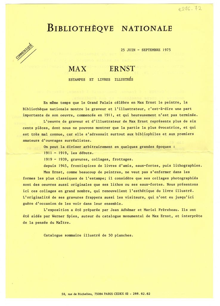 Φωτοαντίγραφο δακτυλόγραφου δελτίου τύπου, χαρτί διπλής όψης, 30×21 εκ., στα γαλλικά, έκθεσης του Max Ernst η οποία διεξάγεται στην Εθνική Βιβλιοθήκη του Παρισιού. Αναγράφονται πληροφορίες για τη διοργάνωση.