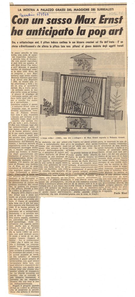 Απόκομμα, χαρτί ακανόνιστου μεγέθους, στα ιταλικά, δημοσίευσης κριτικής έκθεσης του Max Ernst, η οποία διεξάγεται στο Palazzo Grassi στην Βενετία.