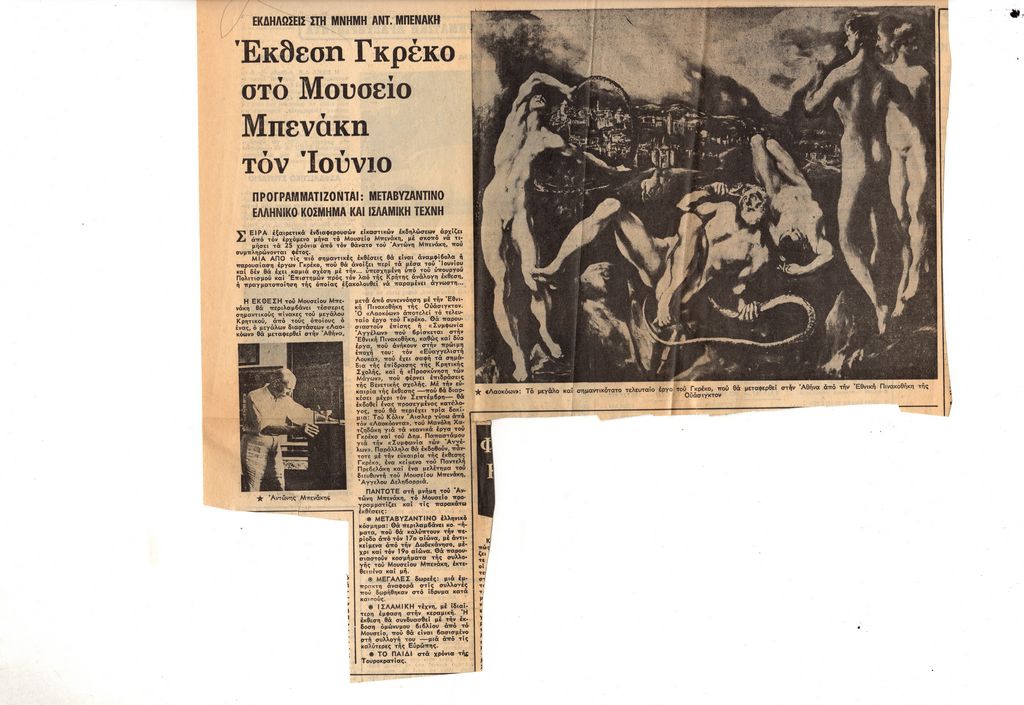 Απόκομμα, χαρτί ακανόνιστου μεγέθους, στα ελληνικά, δημοσίευσης άρθρου το οποίο αναφέρεται σε έκθεση έργων του Δομήνικου Θεοτοκόπουλου, αφιερωμένη στον Αντώνη Μπενάκη, ιδρυτή του Μουσείου Μπενάκη, για τα 25 χρόνια από τον θάνατό του. Επίσης, γίνεται αναφορά σε επικείμενες εκθέσεις στο Μουσείο, ανάμεσα στις οποίες με θέμα το μεταβυζαντινό κόσμημα, το παιδί, τις δωρεές του ιδρύματος και την ισλαμική τέχνη.