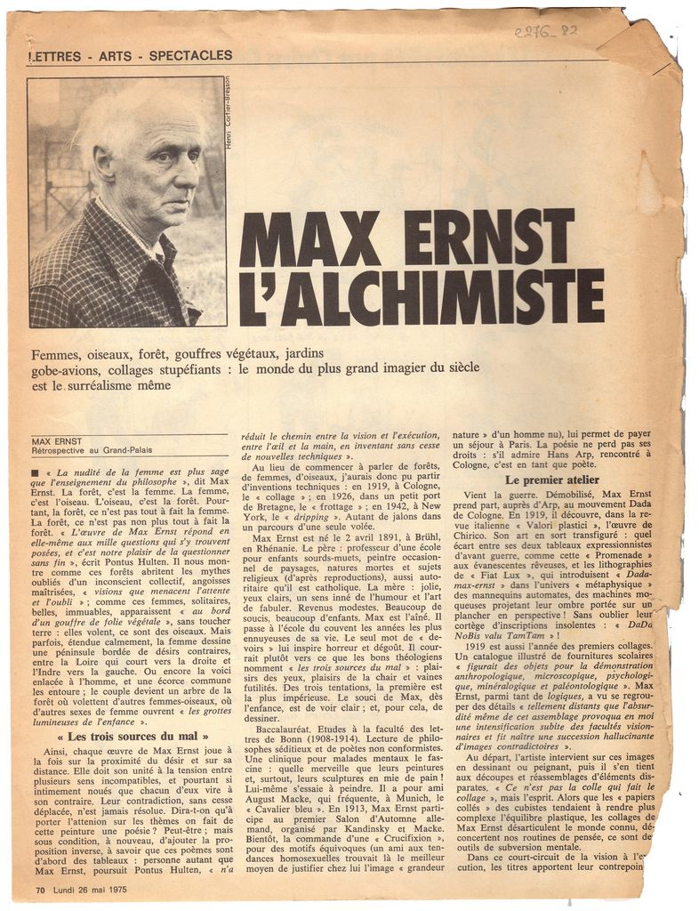 Απόκομμα, χαρτί, 2 φφ, 30×22 εκ., στα γαλλικά, δημοσίευσης άρθρου αφιερωμένου στον Max Ernst, με αφορμή αναδρομική του έκθεση, η οποία διεξάγεται στο Grand Palais στο Παρίσι. Γίνεται μια αναδρομή στη ζωή και στο έργο του.