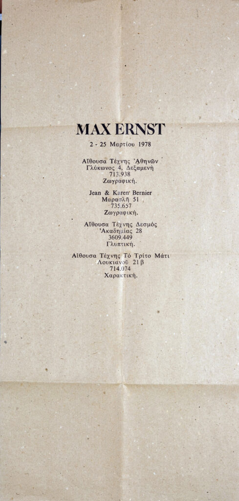 Έντυπο, χαρτί, 35×33 εκ., στα ελληνικά, παράλληλων εκθέσεων του Max Ernst, οι οποίες διεξάγονται στην Αθήνα, στην Αίθουσα Τέχνης Αθηνών, Δεσμός, Το Τρίτο Μάτι και γκαλερί Jean & Karen Bernier. Το έντυπο περιέχει κείμενο της Κάτιας Τσιακμά για τον καλλιτέχνη και το έργο του.