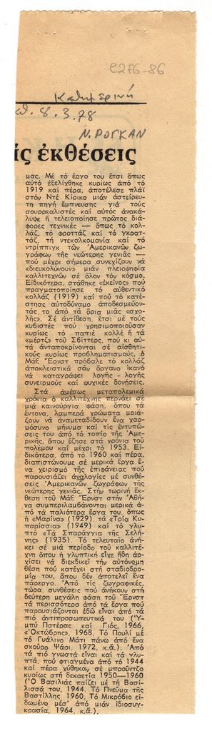 Απόκομμα, χαρτί, 27×7 και 7×5 εκ., στα ελληνικά, δημοσίευσης κριτικής παράλληλων εκθέσεων του Max Ernst, οι οποίες διεξάγονται στις αίθουσες Δεσμός, Το Τρίτο Μάτι, Τέχνης Αθηνών και γκαλερί Jean & Karen Bernier στην Αθήνα. Αναγράφονται σχόλια για τα έργα που παρουσιάζονται.