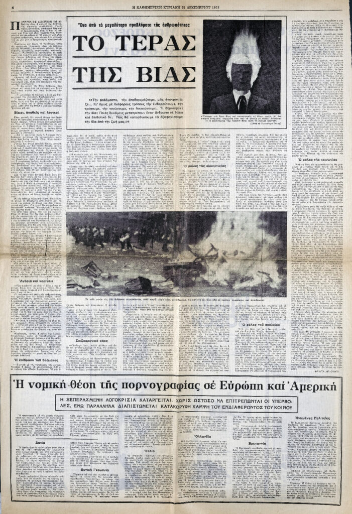 Φρίντα Μπιούμπι, Το τέρας της βίας, Η ΚΑΘΗΜΕΡΙΝΗ, 21/12/1975. Στο ίδιο απόκομμα: Επικίνδυνοι ψυχοπαθείς δολοφόνοι θεραπεύονται στον Καναδά με τη βία. Νίκος Γερακάρης, Ευθύνεται ποινικώς ο Μακαρέζος για την σύμβαση Μακντόναλντ.