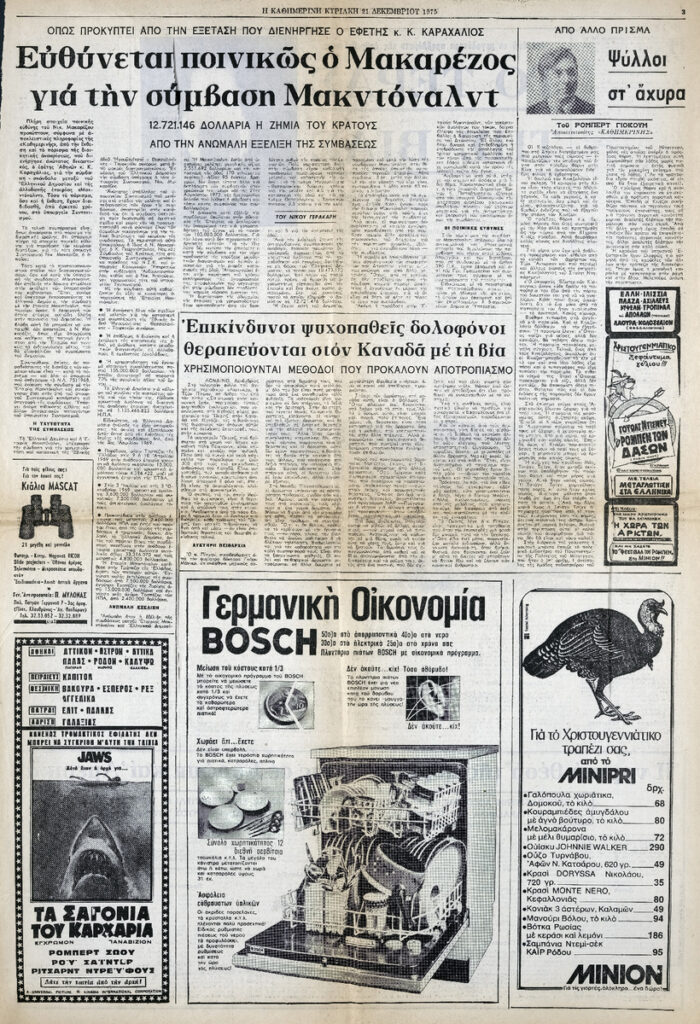 Φρίντα Μπιούμπι, Το τέρας της βίας, Η ΚΑΘΗΜΕΡΙΝΗ, 21/12/1975. Στο ίδιο απόκομμα: Επικίνδυνοι ψυχοπαθείς δολοφόνοι θεραπεύονται στον Καναδά με τη βία. Νίκος Γερακάρης, Ευθύνεται ποινικώς ο Μακαρέζος για την σύμβαση Μακντόναλντ.