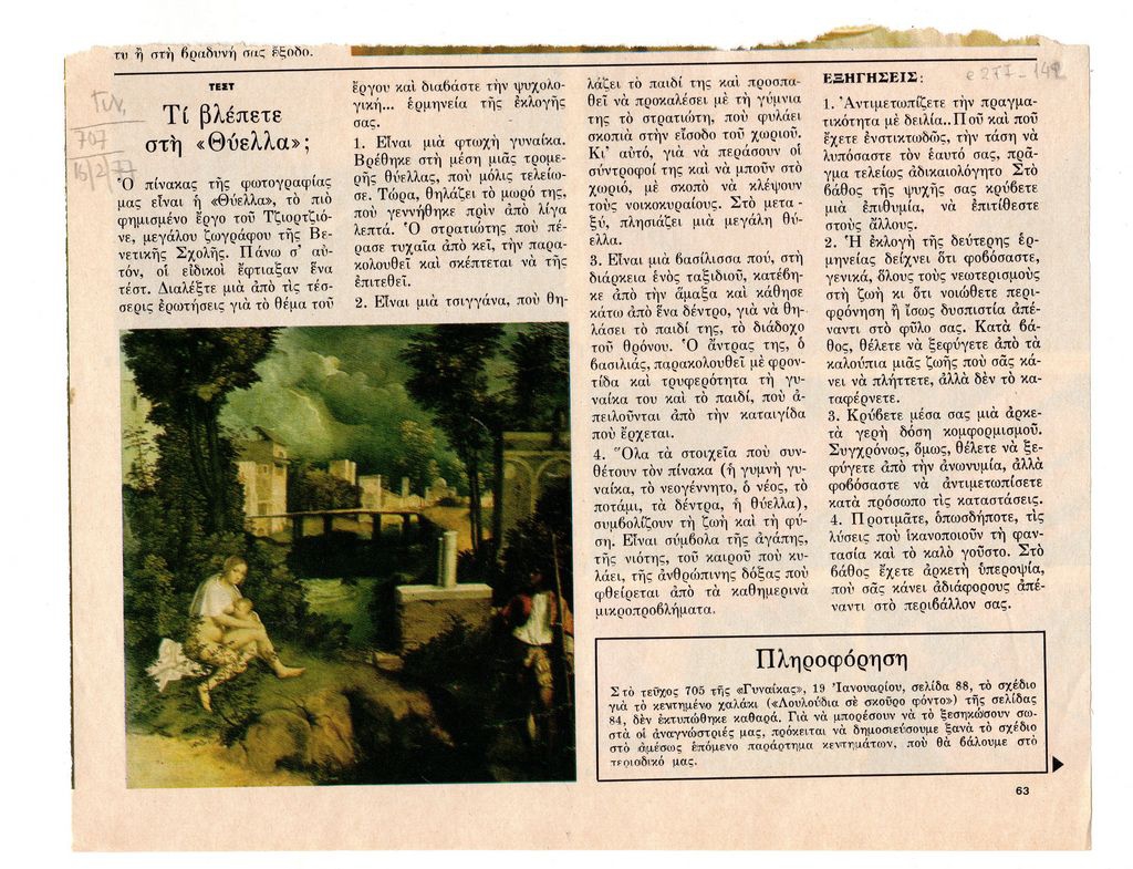 Απόκομμα, έντυπο, χαρτί ιλουστρασιόν, 17,8×22,5 εκ., όπου δημοσιεύεται, στα ελληνικά, τεστ ψυχολογίας με θέμα την ερμηνεία του πίνακα “La Tempesta” του Giorgone. Αριστερά, επιγραφή με τα στοιχεία της δημοσίευσης.