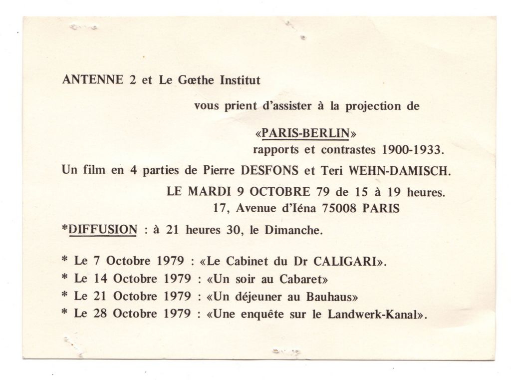Έντυπο, μονόφυλλο, χαρτόνι, μία όψη, 10,5×14,5 εκ. Πρόσκληση στην προβολή της κινηματογραφικής ταινίας των Pierre Desfons και Teri Wehn-Damisch με τίτλο “Paris-Berlin rapports et contrasts 1900-1933” σε τέσσερα μέρη στο Παρίσι το 1979. Στο κύκλο των κινηματογραφικών προβολών θα παρουσιαστούν επίσης οι ταινίες: “Le Cabinet du Dr. Caligari”, “Un soir au Cabaret”, “Un déjeuner au Bauhaus” και “Une enquête sur le Landwerk-Kanal”. Η εκδήλωση διοργανώθηκε από τον σταθμό Antenne 2 και το Goethe Institut στο Παρίσι το 1979. Στην πίσω όψη, βρέθηκε συρραμμένο απόκομμα περιοδικού όπου δημοσιεύεται άρθρο με θέμα τον θάνατο του Γάλλου γλύπτη Emile Gilioli.