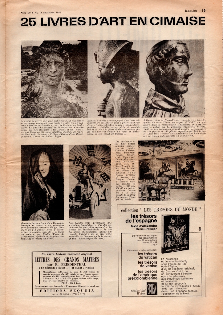 Απόκομμα, έντυπο, χαρτί, δισέλιδο, 42,7×29,0 εκ., όπου δημοσιεύονται, στα γαλλικά, αναγγελίες εκδόσεων τέχνης της περιόδου. Στις άλλες όψεις του τεκμηρίου δημοσιεύεται το άρθρο του Pierre Courthion, “Giacometti. Grand Prix National des Arts” και αναγγελίες εκθέσεων.