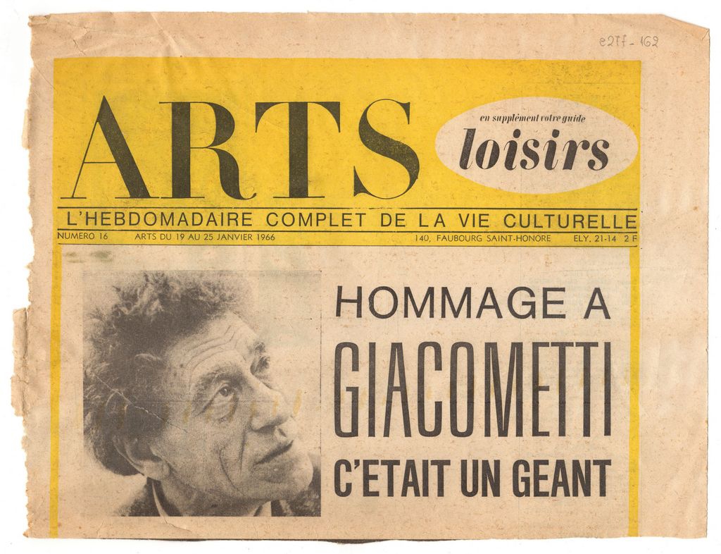 Απόκομμα, έντυπο, χαρτί, 1 απόκομμα και 2 φφ., 22,5×29,5 και 42,0×29,5 εκ., όπου δημοσιεύεται αφιέρωμα στον Ελβετό γλύπτη Alberto Giacometti με αφορμή τον θάνατό του τον Ιανουάριο του 1966. Περιλαμβάνονται απόψεις Γάλλων γλυπτών για το έργων του και αποσπάσματα συνεντεύξεων με τους: André Parinaud, Pierre Cabanne, Pierre Charbonnier και Pierre Dumayet καθώς και σύντομο άρθρο με τίτλο “Jean Genet: Ses dessins sont des joyayx ciselés” (αναδημοσίευση από το: L’atelier de Giacometti, Mercure de France).