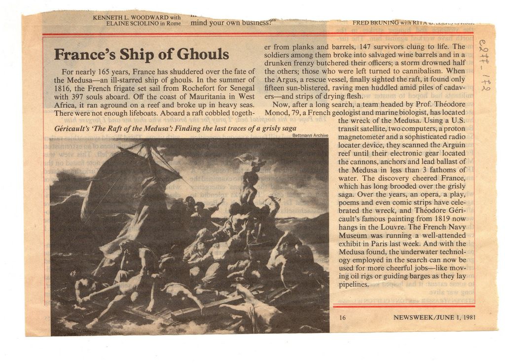 Απόκομμα, έντυπο, χαρτί, 14,0×20,5 εκ., όπου δημοσιεύεται, στα γαλλικά, σχετικά με την ανεύρεση του ναυαγίου του πλοίου “Medusa”, από το οποίο εμπνεύστηκε ο Théodore Géricault τον περίφημο πίνακα “Το ναυάγιο της Μέδουσας”.