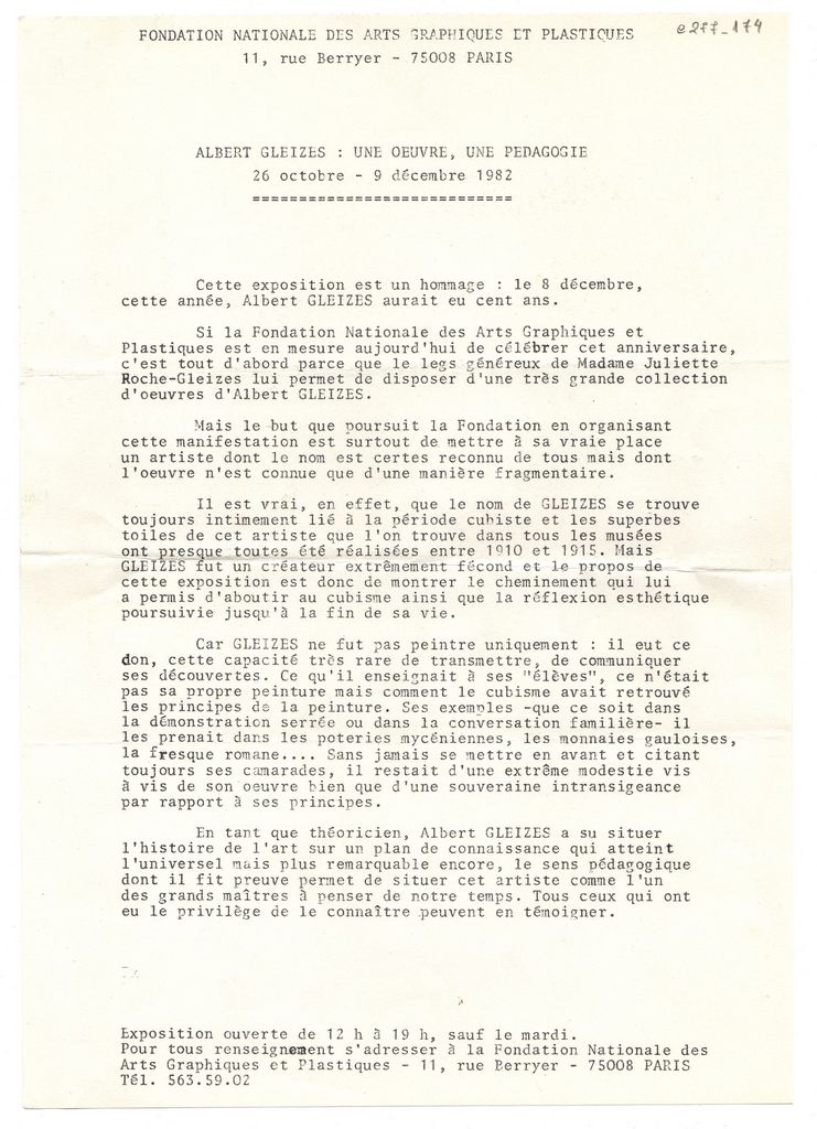 Κείμενο, δακτυλόγραφο, στα γαλλικά, χαρτί, 2 φφ., 29,8×21,0 εκ. Δελτίο τύπου της αναδρομικής έκθεσης του κυβιστή ζωγράφου και θεωρητικού της τέχνης Albert Gleizes στο Παρίσι το 1982. Περιέχει σύντομο βιογραφικό του καλλιτέχνη με σχετική βιβλιογραφία.