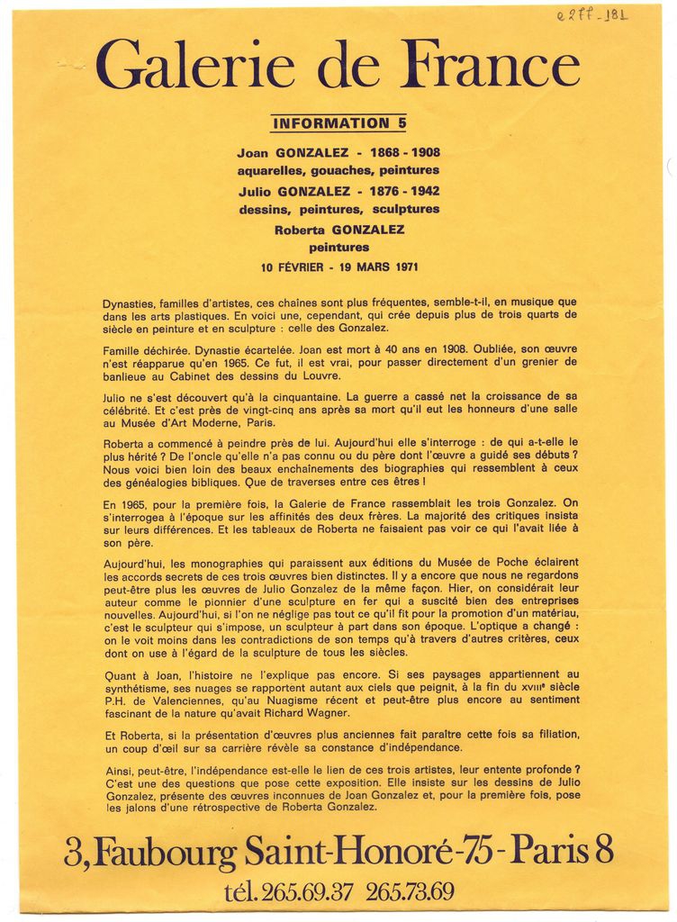 Έντυπο, στα γαλλικά, χαρτί της Galerie de France, 2 φφ., 29,5×21,5 εκ. Δελτίο της κοινής έκθεσης έργων του Joan González, Julio González και της ζωγράφου Roberta González, που διοργανώθηκε στο Παρίσι το 1971. Στο δεύτερο φύλλο, ενημέρωση για εκδόσεις για τους: Zoran Music, Joan Gonzalez, Roberta Gonzalez, Pierre Alechinsky, Julio Gonzalez, Reinhoud, Hans Hartung, J.P. Hodin κ.ά.