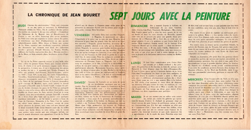 Απόκομμα, έντυπο, χαρτί, 60,0×42,5 εκ., όπου δημοσιεύεται, στα γαλλικά, η εβδομαδιαία στήλη του Jean Bouret “Sept jours avec la peinture”. Αναφέρεται στις θεματικές εκθέσεις με τίτλο “Le Nôtre et l’art des jardins”, “Les années folles du Music-Hall” και “Marcel Leprin, 1891-1933 et ses amis”, καθώς και σε ατομικές εκθέσεις των Maiello, Virduzzo και Simada που πραγματοποιήθηκαν στο Παρίσι τον χειμώνα του 1964. Στην ίδια σελίδα: Jacques Lassaignes και Georges Boudaille “Emilio Pettoruti un précurseur, un initiateur”. Στην άλλη σελίδα, άρθρο του G. Boudaille για τον κυβιστή ζωγράφο Albert Gleizes, κριτικές και αναγγελίες εκθέσεων.