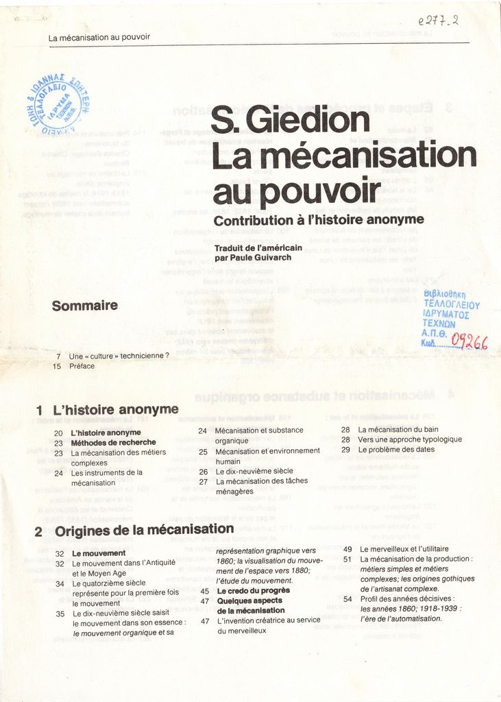 Φωτοαντίγραφο αποκόμματος εντύπου, χαρτί, δύο όψεις, 2 φφ., 29,8×21,0 εκ. Πίνακας των περιεχομένων της μελέτης του ιστορικού τέχνης Siegfried Giedion με τίτλο “La mécanisation au pouvoir: contribution à l’histoire anonyme” σε μετάφραση από τα αγγλικά του Paule Guivarch από τις εκδόσεις του Centre Georges Pompidou [το 1980].