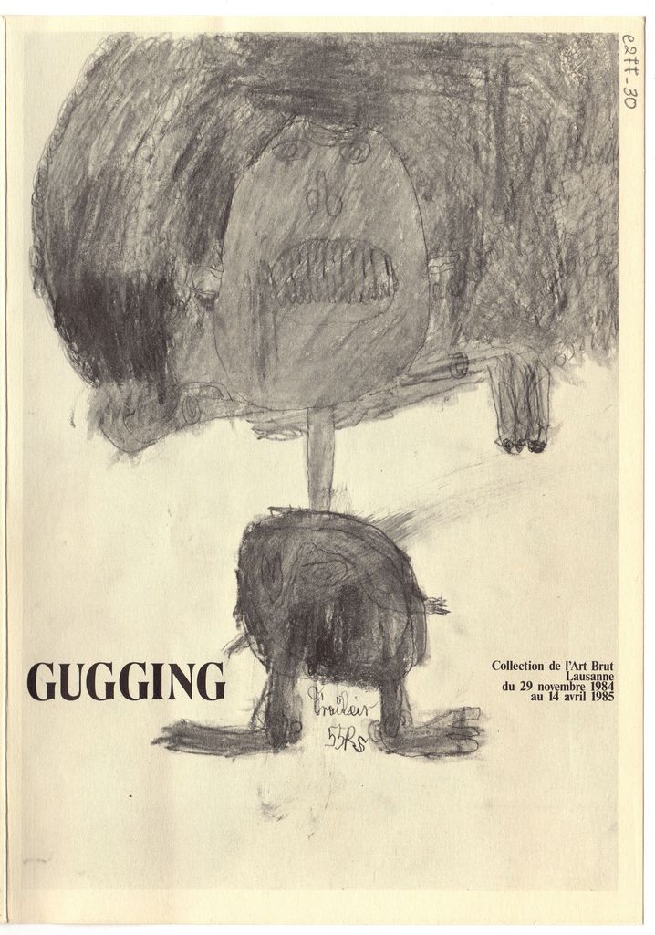 Έντυπο, στα γαλλικά, δίπτυχο, χαρτόνι, 21,0×15,0 εκ. Φυλλάδιο έκθεσης της ομαδική έκθεσης καλλιτεχνών της ομάδας “Gugging”, η οποία δημιουργήθηκε στην ψυχιατρική κλινική του Klosterneuburg κοντά στη Βιέννη. Η έκθεση πραγματοποιήθηκε το 1984/5 στη Λωζάνη.