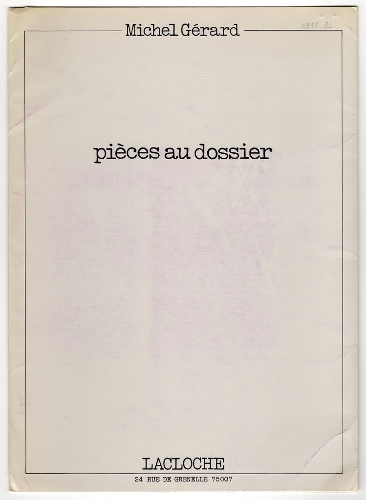 Έντυπο, στα γαλλικά, τρίπτυχο, χαρτόνι ιλουστρασιόν, 29,0×20,5 εκ. Φάκελος για το υλικό της ατομικής έκθεσης έργων του γλύπτη Michel Gérard που πραγματοποιήθηκε στο Παρίσι το 1976. Στο εσώφυλλο, κείμενο για τον καλλιτέχνη και την έκθεση του Pierre Restany.
