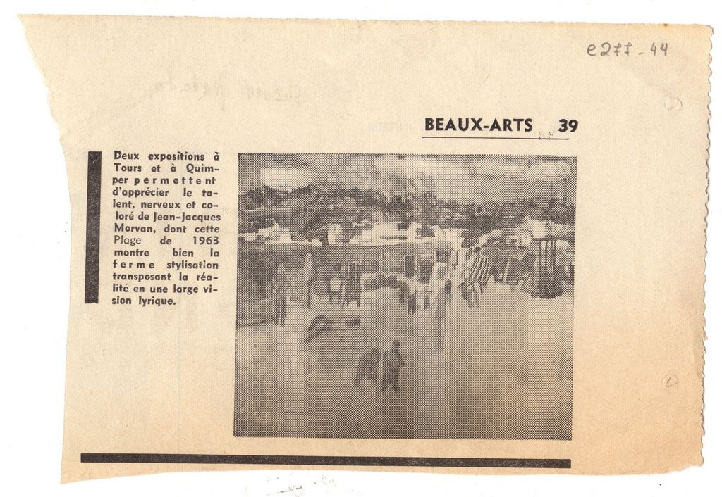 Απόκομμα, έντυπο, χαρτί, 11,5×16,5 εκ., όπου δημοσιεύεται, αναπαραγωγή έργου του Jean-Jacques Morvan που συνοδεύεται από σύντομη αναφορά σε δύο εκθέσεις έργων του στην Tours και το Quimper. Στην άλλη όψη: τμήμα φωτογραφίας της ζωγράφου Suzanne Valadon με αφιέρωση στον φίλο της, επίσης ζωγράφου, Gazi le Tatar.