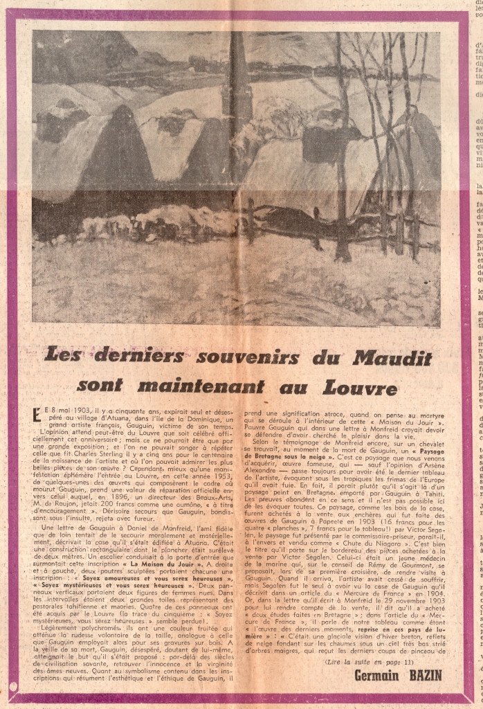 Απόκομμα, έντυπο, χαρτί, δύο όψεις, 60,0×42,5 εκ., όπου δημοσιεύεται, στα γαλλικά, άρθρο του Germain Bazin σχετικά με τα τελευταία έργα του Paul Gauguin. Στην ίδια σελίδα, δημοσιεύεται άρθρο Jean Loize με τίτλο “Il faut réhabiliter Gauguin”. Επάνω, επιγραφή με την ημερομηνία δημοσίευσης. Στην άλλη σελίδα δημοσιεύεται απόσπασμα άρθρου του Louis Grodecki με τίτλο “La merveilleuse histoire du vitrail français”.