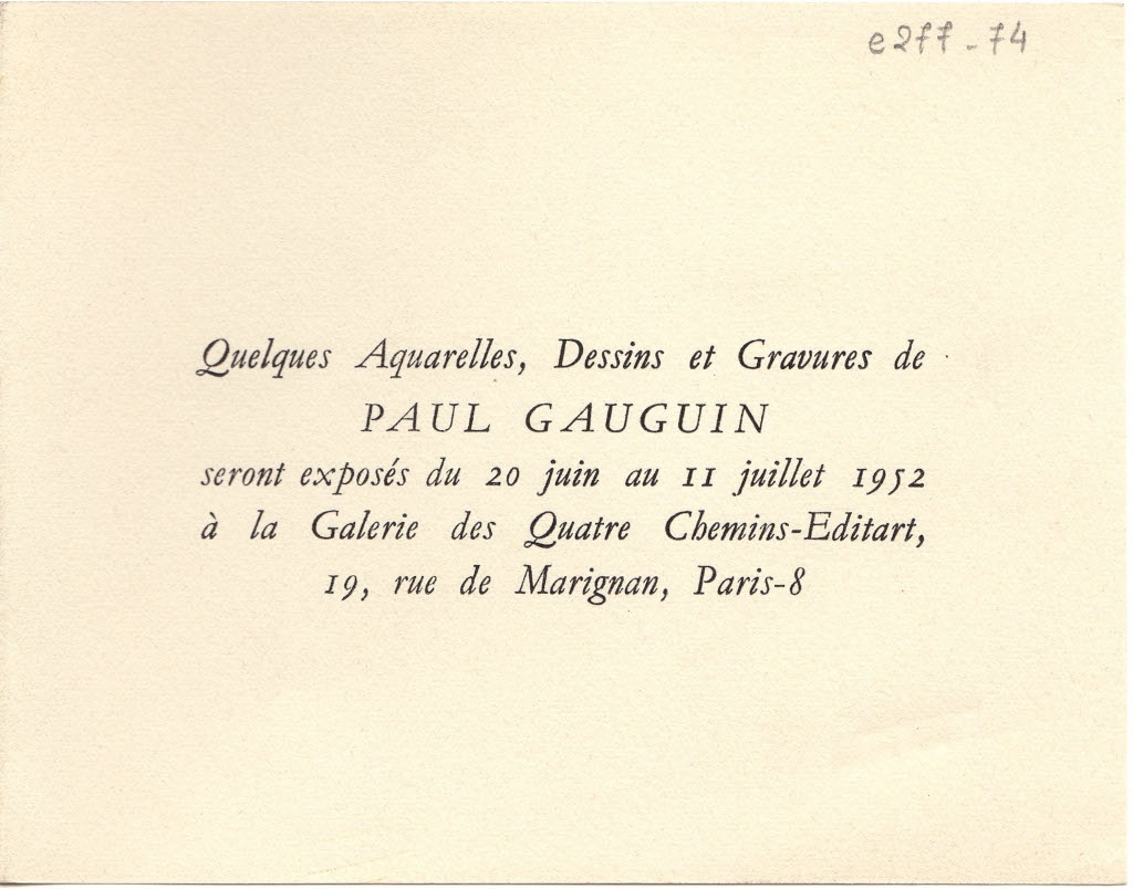 ;Έντυπο, δίπτυχο, χαρτόνι, 10,5×13,5 εκ. Πρόσκληση έκθεσης έργων του Paul Gauguin που διοργανώθηκε στο Παρίσι το 1952. Στο οπισθόφυλλο αναγγέλλεται η έκδοση facsmile “Le Carne de Paul Gauguin” με κείμενα του René Huygue/