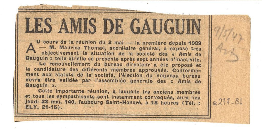 Απόκομμα, έντυπο, χαρτί, 6,0×12,0 εκ., όπου δημοσιεύεται, στα γαλλικά, σχετικά για την επικείμενη συνεδρίαση του συλλόγου “Les amis de Gauguin” μετά από επτά χρόνια αδράνειας.Δεξιά, επιγραφή με τα στοιχεία της δημοσίευσης.