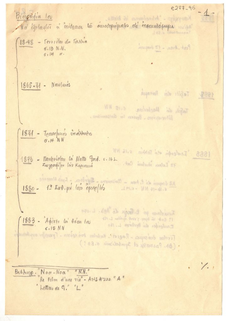 Κείμενο, χειρόγραφο, με μολύβι, στα ελληνικά, 2 φφ., 25,0×17,5 εκ. Οι σημαντικότεροι σταθμοί για τη ζωή και το έργο του Paul Gauguin σε χρονολογική διαδοχή.