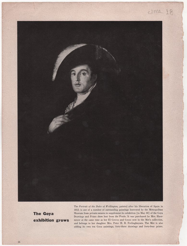 Απόκομμα εντύπου, χαρτί, 31 x 23.5 εκ., στα γαλλικά, με α/μ αναπαραγωγή έργου του Francisco Goya. Σημειώνεται πως συμπεριλαμβάνεται σε έκθεση που διεξάγεται στο Metropolitan Museum of Art στη Νέα Υόρκη. Δίνονται πληροφορίες για το έργο. Στην πίσω όψη, αναπαραγωγές έργων των John Hultberg, Herbert Barnett, Sarkis Sarkisian.