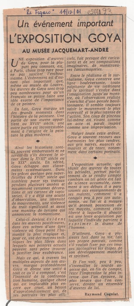 Απόκομμα, χαρτί, 24 x 10 εκ., στα γαλλικά, δημοσίευσης άρθρου το οποίο αναφέρεται στο εικαστικό έργο του Francisco Goya, με αφορμή αναδρομική έκθεση για τον καλλιτέχνη, η οποία διεξάγεται στο Musée Jacquemart-André στο Παρίσι.