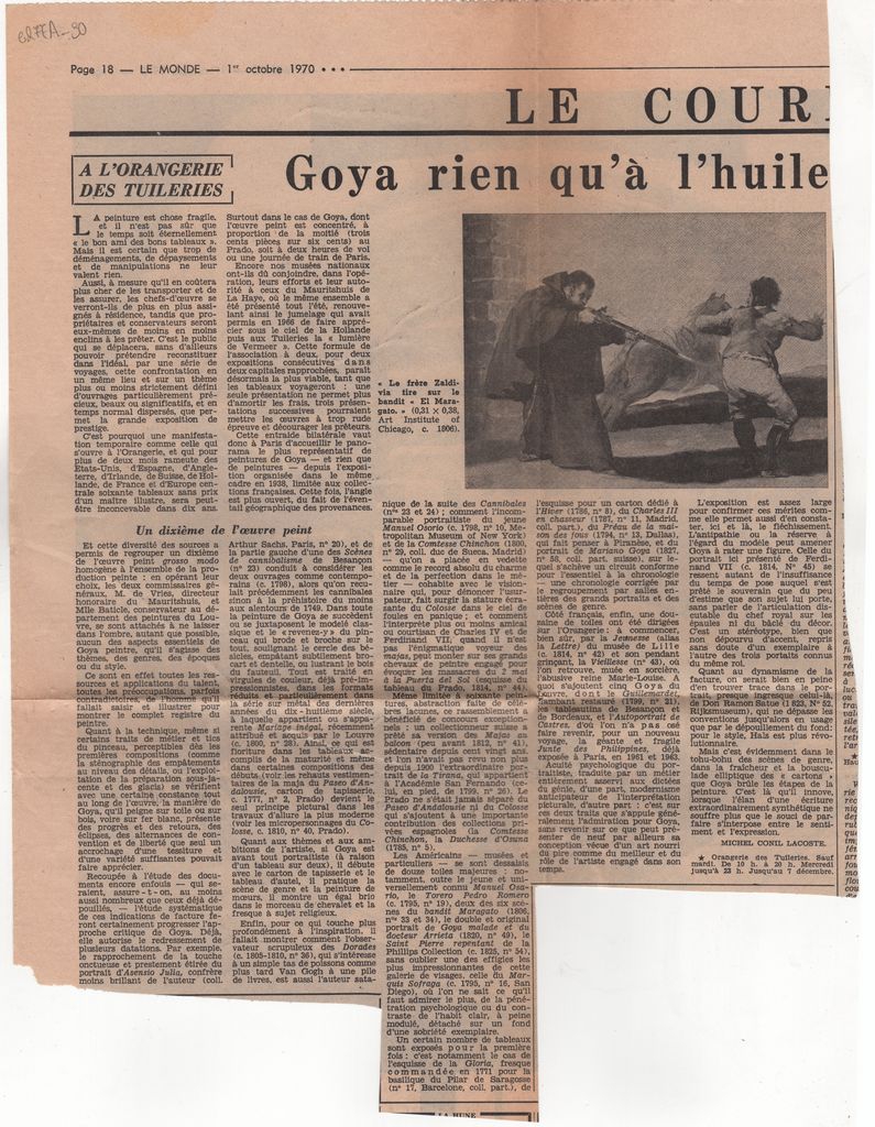 Απόκομμα, χαρτί ακανόνιστου μεγέθους, στα γαλλικά, δημοσίευσης άρθρου αναφερόμενου στο εικαστικό έργο του Francisco Goya, με αφορμή αναδρομική έκθεση έργων του στην Orangerie στο Παρίσι. Το απόκομμα εικονογραφείται.