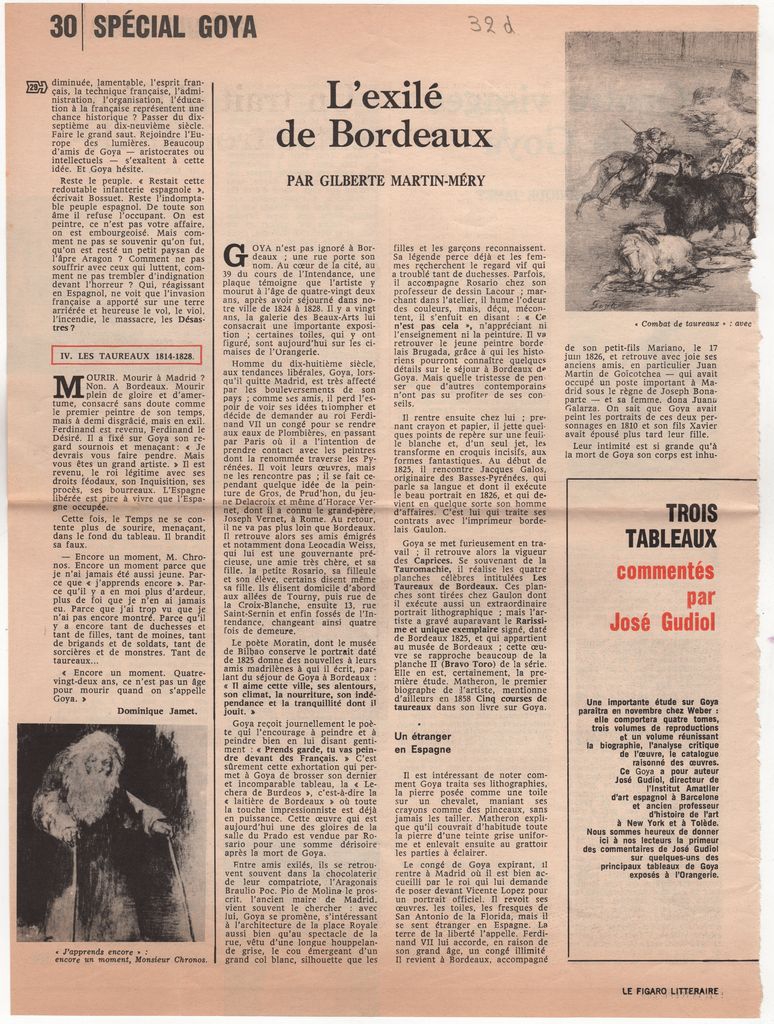 Απόκομμα, χαρτί διπλής όψης, 36 x 26.5 εκ., στα γαλλικά, δημοσίευσης άρθρου αναφερόμενου στην αναδρομική έκθεση-αφιέρωμα στον Francisco Goya, η οποία διεξάγεται στην Orangerie στο Παρίσι. Δίνονται πληροφορίες για τα έργα που συμπεριλαμβάνονται στην έκθεση. Το παρόν δημοσιεύτηκε στο πλαίσιο αφιερώματος του εντύπου στον καλλιτέχνη, στο πλαίσιο της έκθεσης.