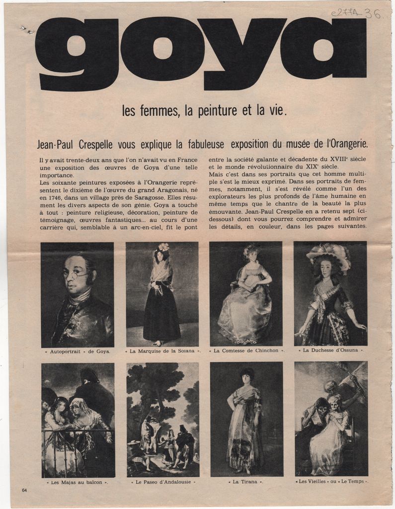 Απόκομμα, χαρτί, 3 φφ, 31 x 23.5 εκ., στα γαλλικά, δημοσίευσης άρθρου αναφερόμενου στην αναδρομική έκθεση-αφιέρωμα στον Francisco Goya, στην Orangerie στο Παρίσι. Δίνονται πληροφορίες για τα έργα.