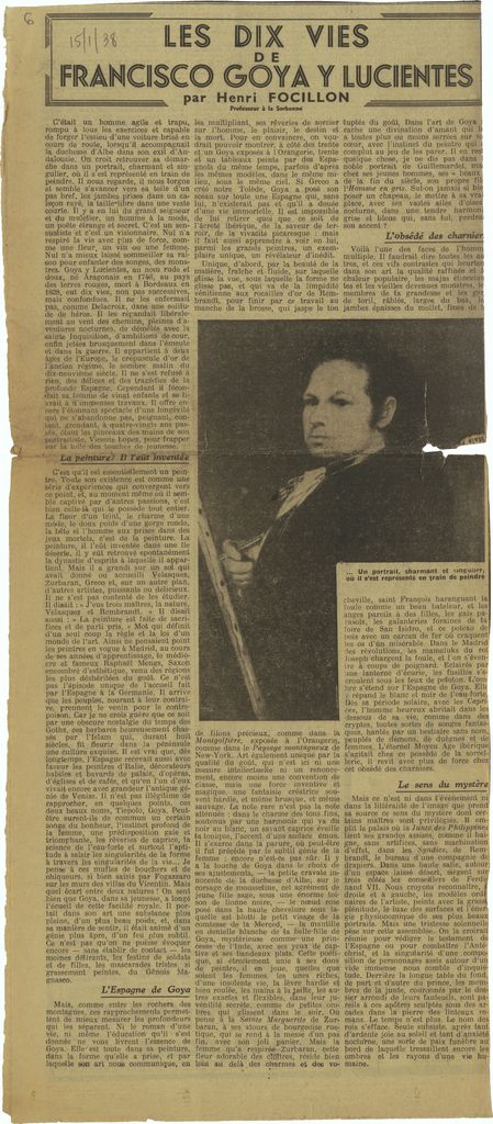 Απόκομμα, χαρτί, 50 x 22 εκ., στα γαλλικά, δημοσίευσης κειμένου αναφερόμενου στη ζωή και στο εικαστικό έργο του Francisco Goya. Το απόκομμα εικονογραφείται και φέρει επιγραφή.