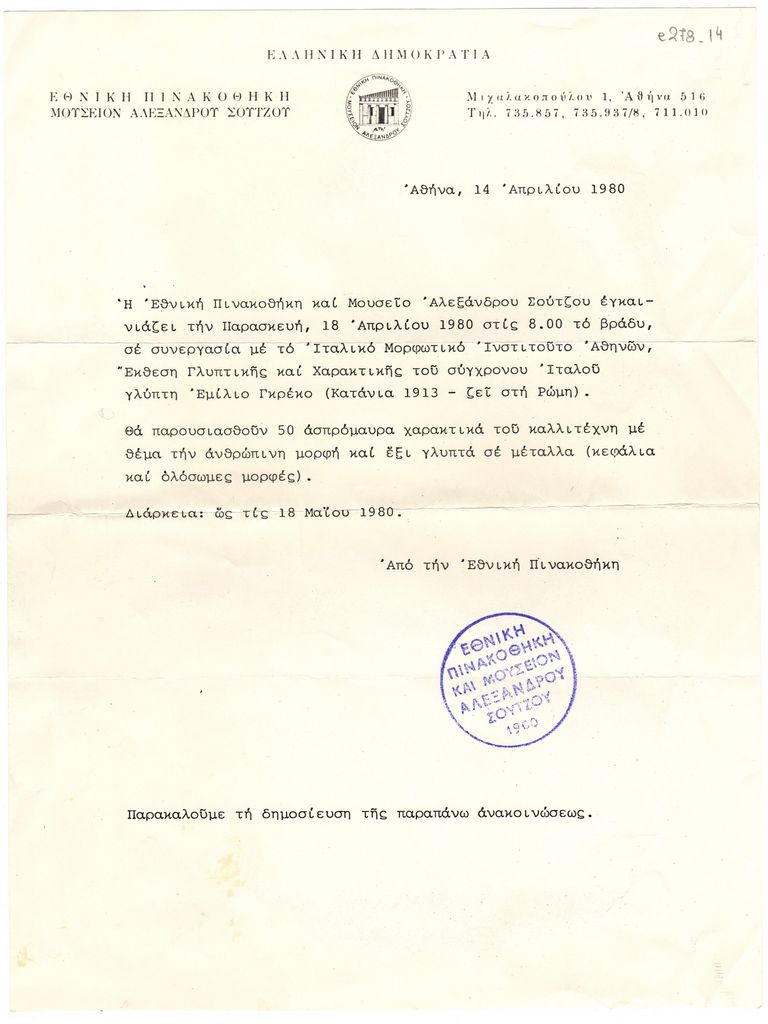 Δακτυλόγραφο δελτίο τύπου, χαρτί, 28.5×21.5 εκ., στα ελληνικά, έκθεσης του Emilio Greco, η οποία διεξάγεται στην Εθνική Πινακοθήκη στην Αθήνα. Αναγράφονται λεπτομέρειες για τα έργα του καλλιτέχνη που παρουσιάζονται σε αυτή.