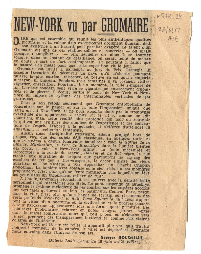 Απόκομμα, χαρτί διπλής όψης, 16.5×12.5 εκ., στα γαλλικά, δημοσίευσης κριτικής έκθεσης του Marcel Gromaire, η οποία διεξάγεται στην γκαλερί Louis Carré στο Παρίσι. Σχολιάζεται η θεματική της, η Νέα Υόρκη, μέσα από τα μάτια του καλλιτέχνη.