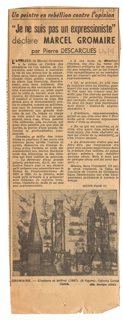 Απόκομμα, χαρτί, 2 φφ, 10×28 εκ., στα γαλλικά, δημοσίευσης το οποίο αναφέρεται στη ζωγραφική του Marcel Gromaire. Σχολιάζεται δήλωση του καλλιτέχνη αναφορικά με τη σχέση του με τον εξπρεσσιονισμό. Αναγράφονται σχετικές λεπτομέρειες.