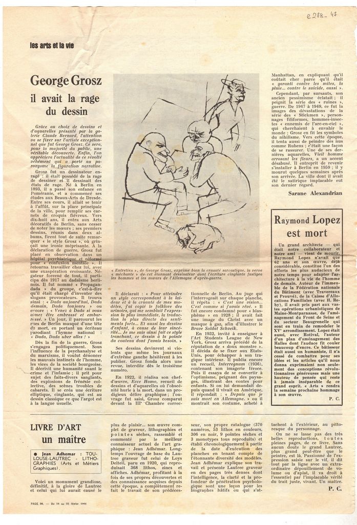 Απόκομμα, χαρτί, 40×28 εκ., στα γαλλικά, δημοσίευσης άρθρου αναφερόμενου στη ζωή και ζωγραφική του George Grosz, με αφορμή έκθεση η οποία διεξάγεται στην γκαλερί Claude Bernard στο Παρίσι.