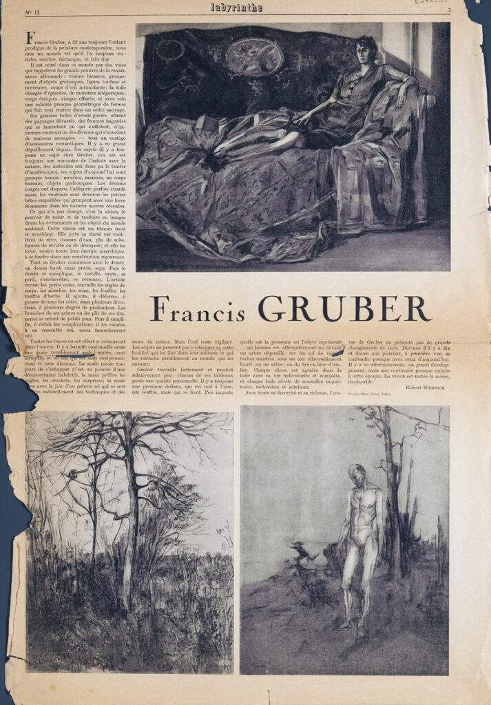 Απόκομμα, χαρτί, 50×33 εκ., στα γαλλικά, δημοσίευσης κειμένου αναφερόμενου στη ζωγραφική του Francis Gruber.