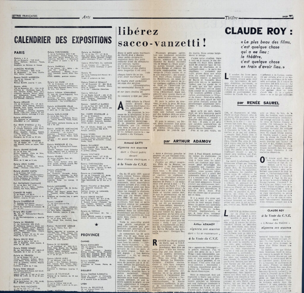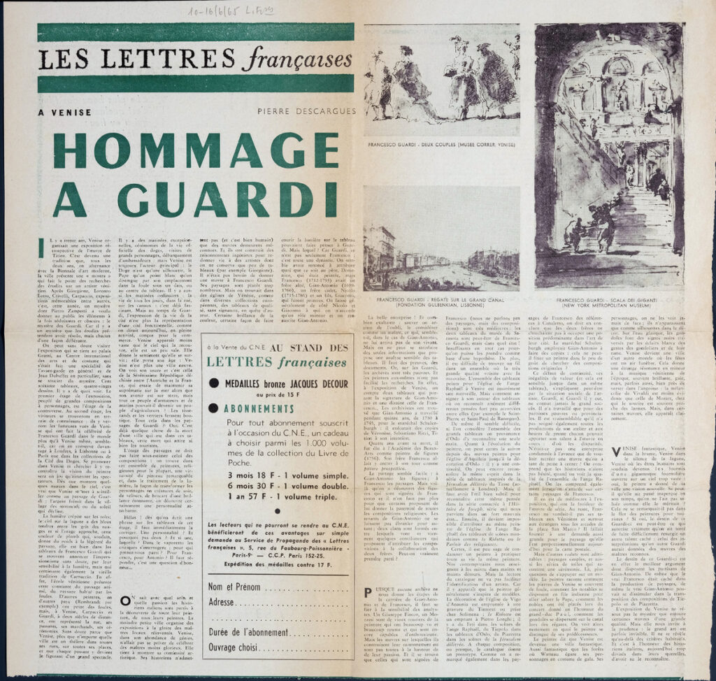 Απόκομμα, χαρτί, 42×42 εκ., στα γαλλικά, δημοσίευσης κριτικής έκθεσης αφιερωμένης στον Gian Antonio και Francesco Guardi, η οποία διεξάγεται στο Palazzo Grassi στην Βενετία. Αναγράφονται λεπτομέρειες για τη διοργάνωση και τα έργα που παρουσιάζονται σε αυτή.