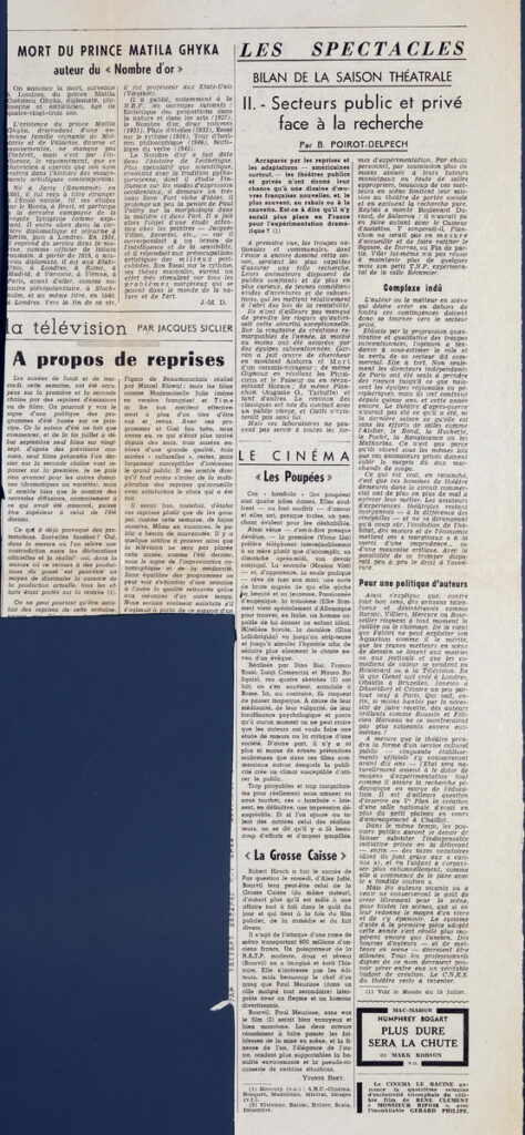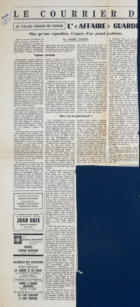 Απόκομμα, χαρτί ακανόνιστου μεγέθους, στα γαλλικά, δημοσίευσης κριτικής έκθεσης αφιερωμένης στους Francesco και Gian Antonio Guardi, η οποία διεξάγεται στο Palazzo Grassi στη Βενετία. Αναγράφονται βιογραφικές λεπτομέρειες καθώς και σχόλια για το εικαστικό τους έργο. Στο ίδιο απόκομμα, αναφορά σε εκθέσεις της περιόδου, ανάμεσα στις οποίες των Juan Gris, Hanna & Gabriel Rechowicz και θεματικές “Peintres d’ Union Soviétique”, “Les jardins et les fleurs”, “De l’ art construit à l’ art cinétique”.