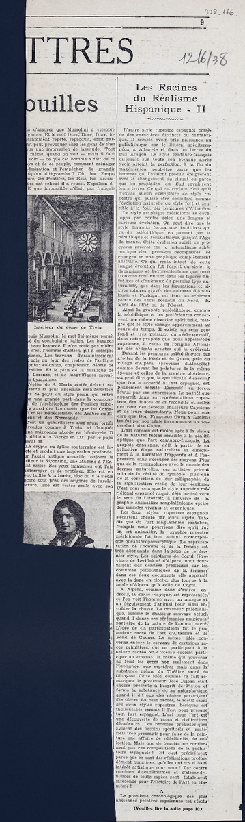 Απόκομμα της εφημερίδας “La Métropole”, έντυπο, στα γαλλικά, χαρτί, διπλής όψης, 54,5×14 εκ., όπου δημοσιεύεται άρθρο για τις ρίζες του ισπανικού ρεαλισμού. Το απόσπασμα εικονογραφείται. Πάνω από τον τίτλο, επιγραφή με τα στοιχεία έκδοσης.