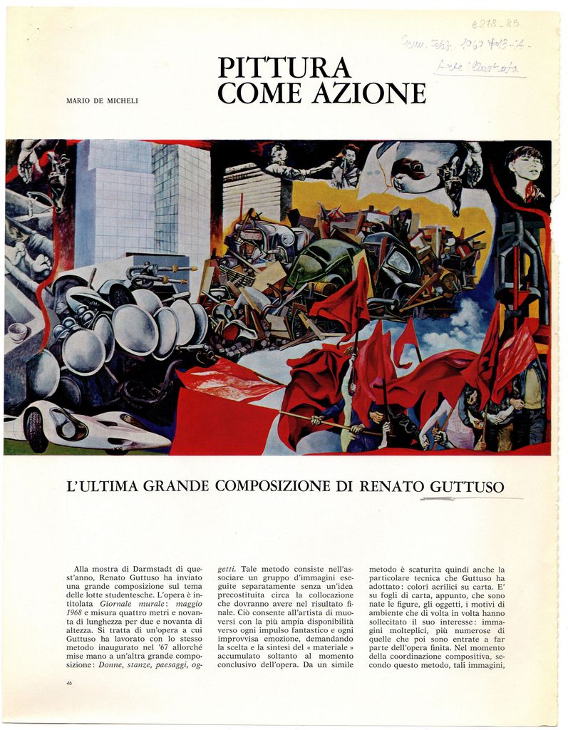 Απόκομμα, χαρτί, 3 φφ, 31×24 εκ., στα ιταλικά, δημοσίευσης άρθρου το οποίο είναι αφιερωμένο στο έργο του Renato Guttuso “Giornale murale: maggio 1968”, το οποίο παρουσιάστηκε σε έκθεση του καλλιτέχνη στο Darmstadt.