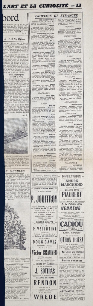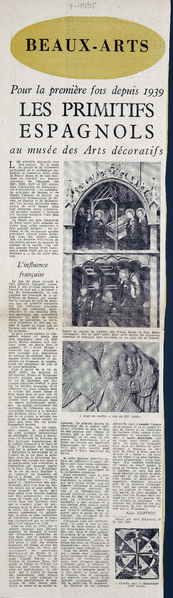 Απόκομμα του περιοδικού “Arts”, 11-17/05/1955, έντυπο, στα γαλλικά, χαρτί, διπλής όψης, 59,5×16 εκ., όπου δημοσιεύεται άρθρο του συγγραφέα A. Jouffroy, σχετικά με έκθεση Ισπανών πριμιτιβιστών στο Μουσείο Διακοσμητικών Τεχνών. Το απόσπασμα εικονογραφείται. Πάνω από τον τίτλο, επιγραφή με τα στοιχεία έκδοσης.