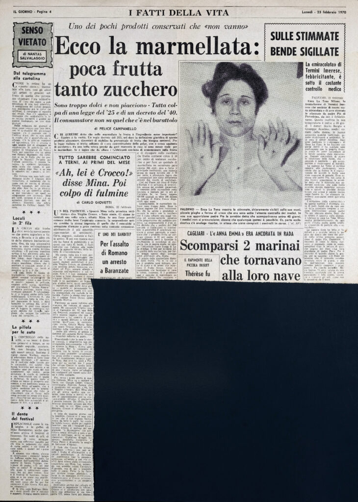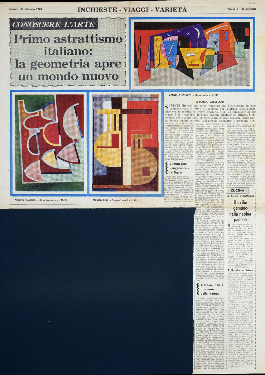 Απόκομμα της εφημερίδας “Il Giorno”, έντυπο, στα ιταλικά, χαρτί, διπλής όψης, 57×41 εκ., όπου δημοσιέυεται άρθρο του ιστορικού και κριτικού τέχνης M. Valsecchi, σχετικά με τα πρώτα έργα ιταλικής αφηρημένης τέχνης και το στοιχείο της γεωμετρίας. Το απόσπασμα εικονογραφείται.