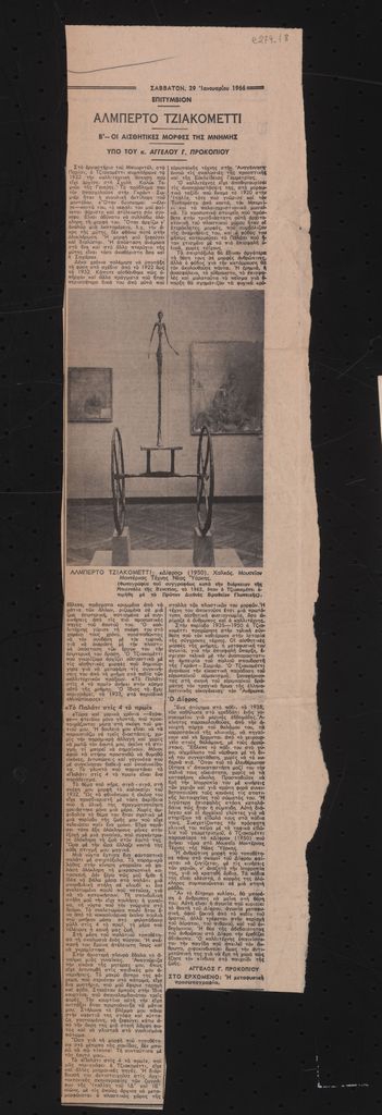 Απόκομμα, χαρτί ακανόνιστου μεγέθους, στα ελληνικά, δημοσίευσης άρθρου αναφερόμενου στο εικαστικό έργο του Alberto Giacometti.