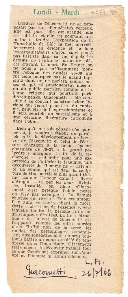 Απόκομμα, χαρτί, 21×9 εκ., στα γαλλικά, δημοσίευσης κριτικής έκθεσης του Alberto Giacometti, η οποία διεξάγεται στην Πινακοθήκη της Βασιλείας. Αναγράφονται λεπτομέρειες και σχολιάζονται τα θέματα με τα οποία ασχολείται.