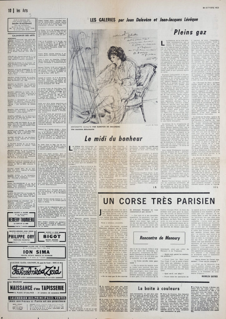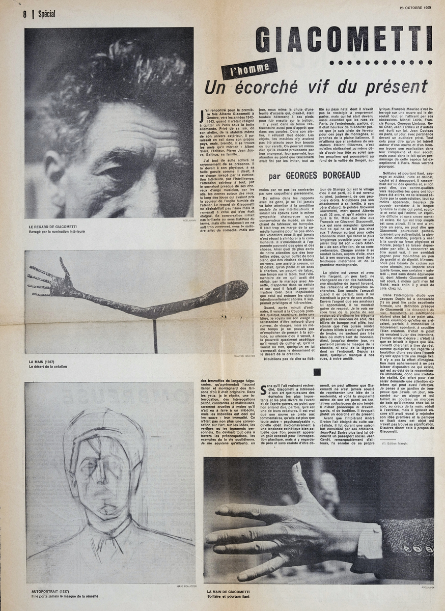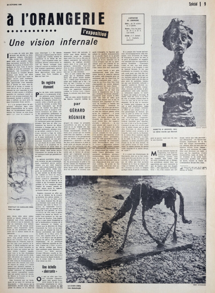 Απόκομμα, χαρτί, 60×43 εκ., στα γαλλικά, δημοσίευσης κειμένου αφιερωμένου στον Alberto Giacometti, το οποίο δημοσιεύεται με αφορμή αφιέρωμα του εντύπου σε αναδρομική έκθεση του καλλιτέχνη, η οποία διεξάγεται στην Orangerie στο Παρίσι.
