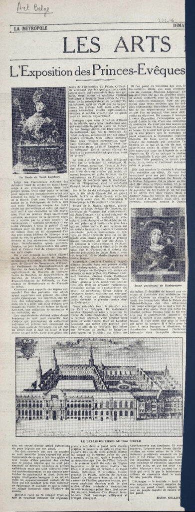 Απόκομμα, έντυπο, στα γαλλικά, χαρτί, διπλής όψης, 54×20,5 εκ., όπου δημοσιεύεται άρθρο για έκθεση στο Ανάκτορο Prince-Bishops στο Βέλγιο. Το απόσπασμα εικονογραφείται. Πάνω από τον τίτλο, επιγραφή.