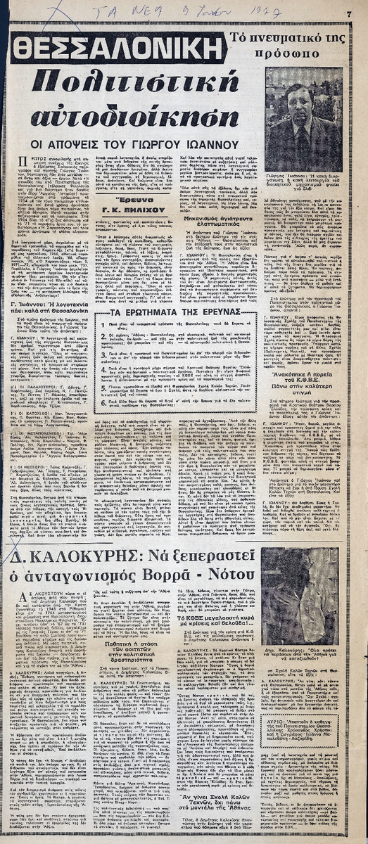 Θεσσαλονίκη. Το πνευματικό της πρόσωπο. Πολιτιστική αυτοδιοίκηση. Οι απόψεις του Γιώργου Ιωάννου, Δ. Καλοκύρης: Να ξεπεραστεί ο ανταγωνισμός Βορρά-Νότου