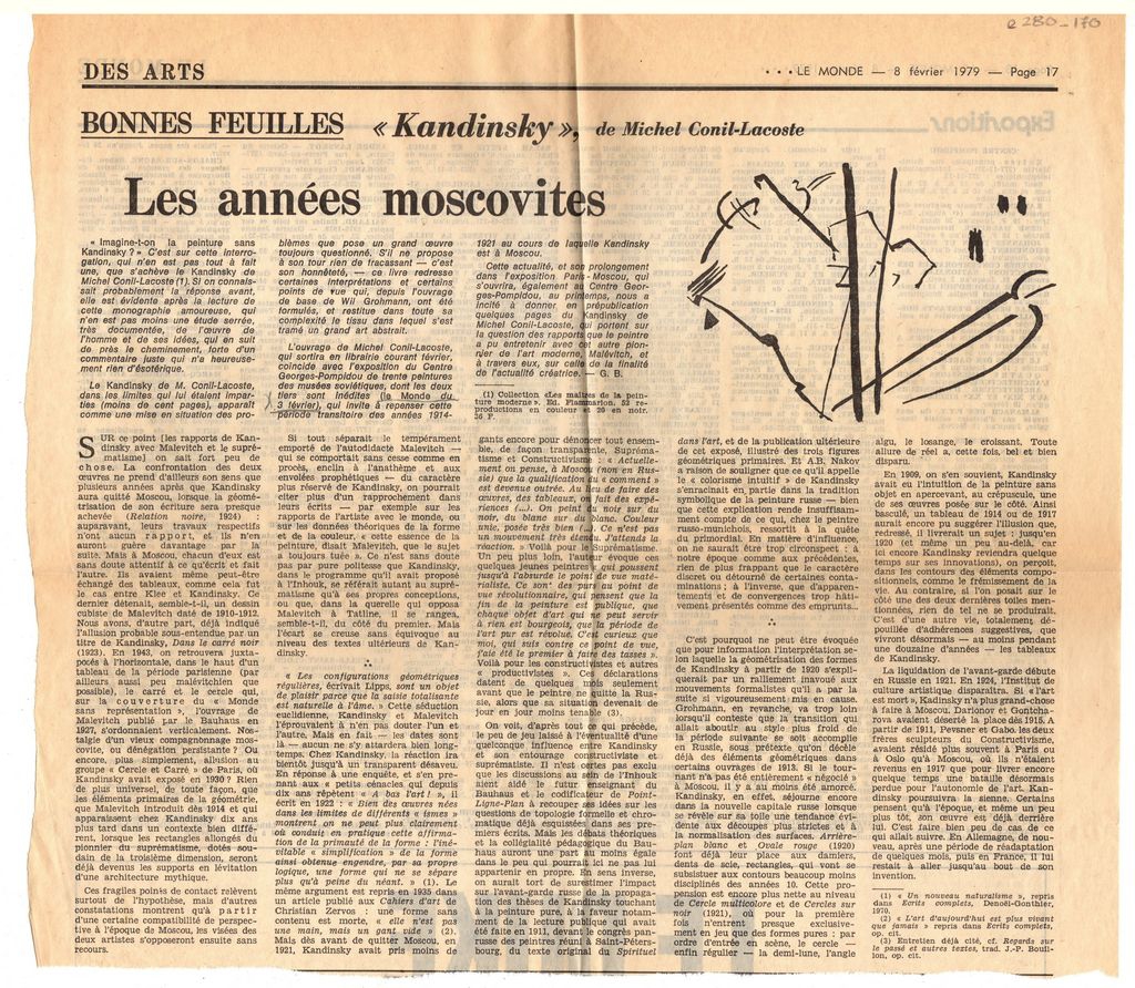 Απόκομμα, χαρτί, 29.5×33 εκ., στα γαλλικά, δημοσίευσης άρθρου το οποίο αναφέρεται σε κυκλοφορία βιβλίου του Michel Conil Lacoste, αφιερωμένου στον Wassily Kandinsky. Δίνεται απόσπασμα του βιβλίου στο οποίο σχολιάζεται η σχέση του καλλιτέχνη με τον Malevitch και γίνεται αναφορά σε έκθεση έργων του καλλιτέχνη στο Centre Georges Pompidou.