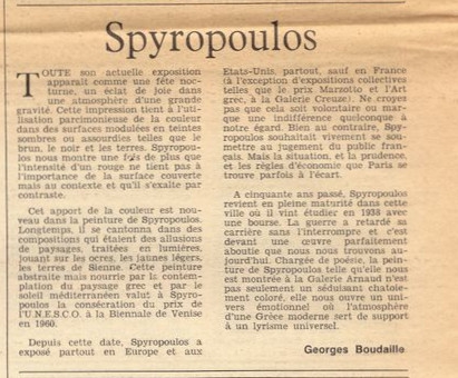 Απόκομμα, χαρτί, 33×15 εκ., στα γαλλικά, δημοσίευσης κριτικής έκθεσης του Γιάννη Σπυρόπουλου, η οποία διεξάγεται στην Galerie Arnaud στο Παρίσι.