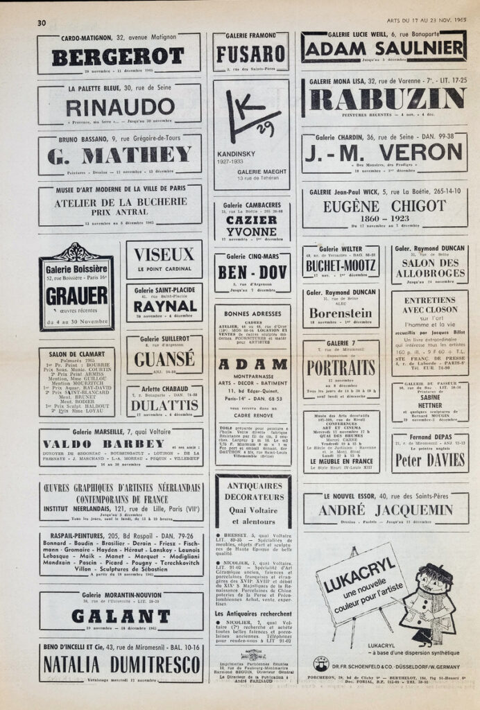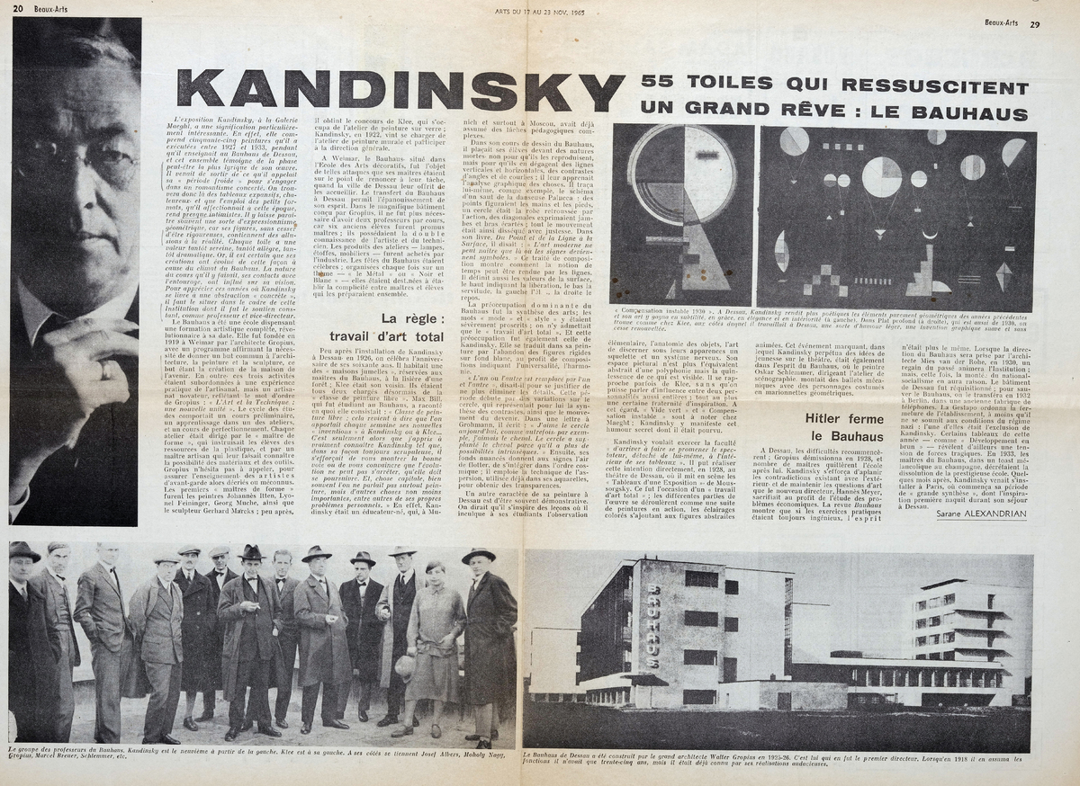 Απόκομμα, χαρτί, 2 φφ, 42×29 εκ., στα γαλλικά, δημοσίευσης κριτικής έκθεσης του Wassily Kandinsky, η οποία διεξάγεται στην γκαλερί Maeght στο Παρίσι και στην οποία παρουσιάζονται έργα του καλλιτέχνη, τα οποία φιλοτέχνησε κατά την περίοδο 1927-1933, όπου δίδασκε στη Σχολή Bauhaus της Dessau. Αναγράφονται λεπτομέρειες και σχόλια για την έκθεση και πληροφορίες για τη διδασκαλία του και το εικαστικό του έργο κατά την παραμονή του στην Dessau.