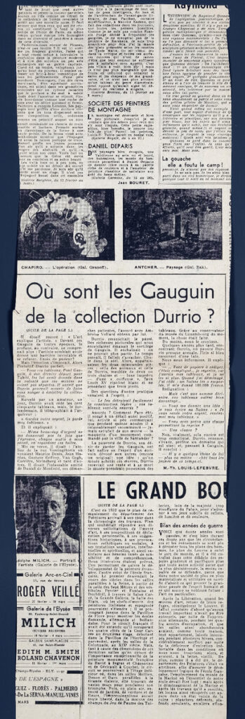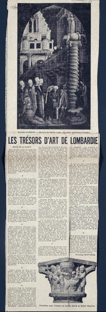 Απόκομμα εφημερίδας, έντυπο, στα γαλλικά, χαρτί, δύο όψεις, 52×15 εκ., όπου δημοσιεύεται άρθρο σχετικά με καλλιτεχνικούς θησαυρούς που προέρχονται από την περιοχή της Λομβαρδίας. Το τεκμήριο εικονογραφείται. Πάνω από τον τίτλο, επιγραφή με στοιχεία της έκδοσης.